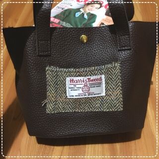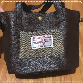 合皮のバッグのポケット部分にハリスツイードの布がついてる感じ。